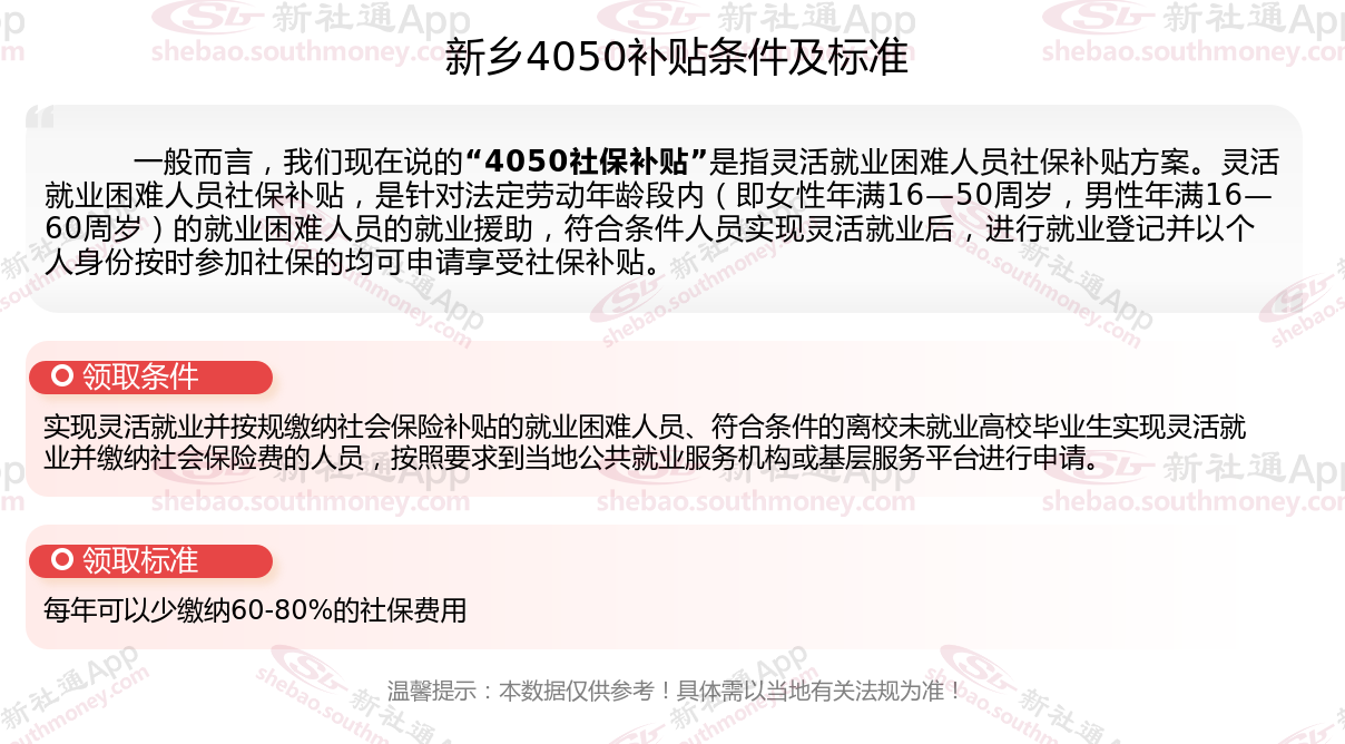 一、2025年新乡灵活就业4050社保补贴标准及条件是什么