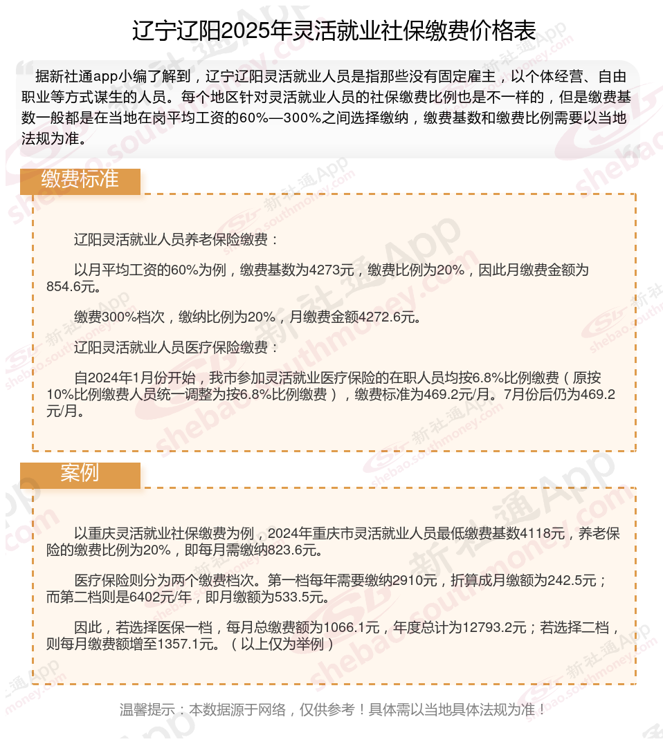 接下来了解一下,辽宁辽阳灵活就业人员社保缴费标准是多少?退休能领多少钱呢?根据新社通app-社保缴费查询工具提供的2025社保缴费标准详情数据: