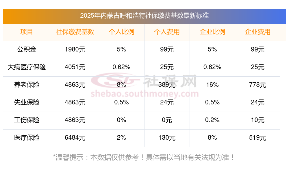 2025社保交多少钱?下表是2025年内蒙古呼和浩特社保费用明细参考,新社通app-社保缴费查询工具提供的最新数据如下: