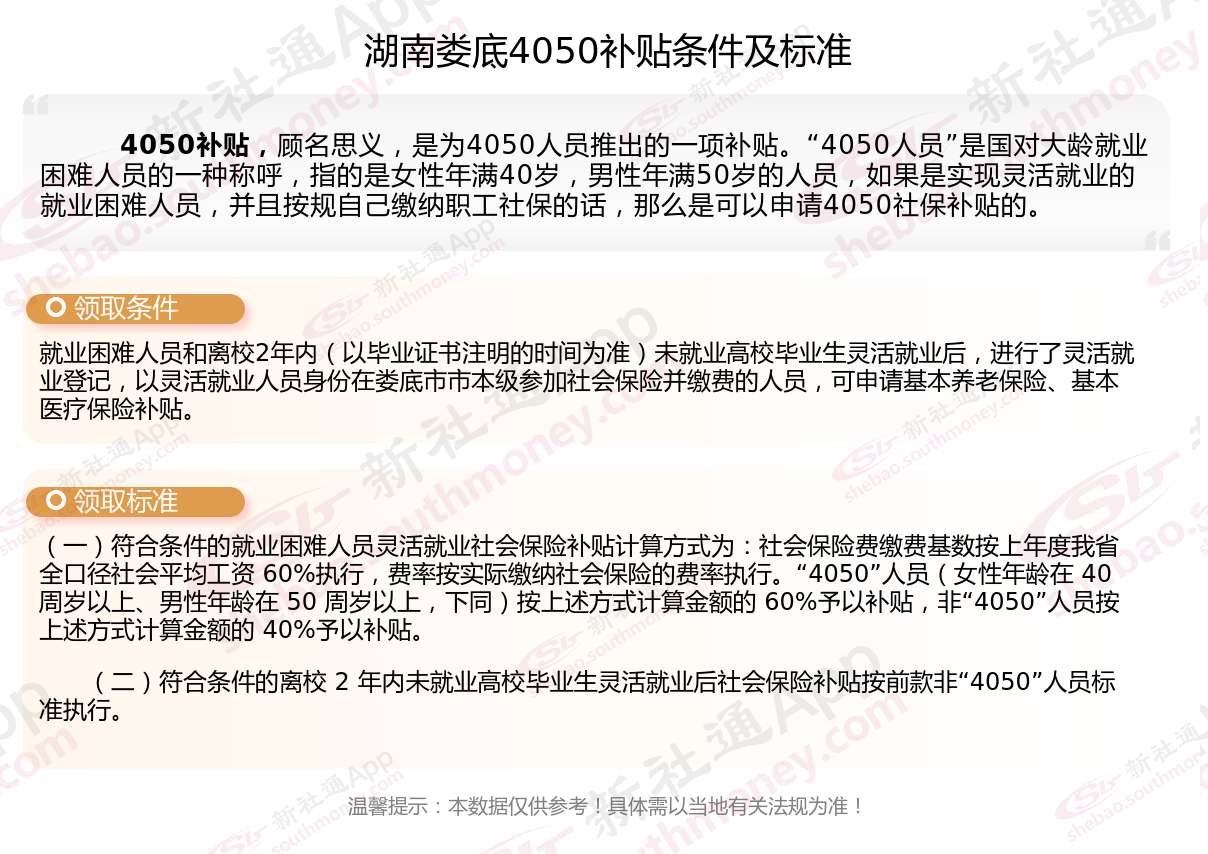二、2025年湖南娄底4050社保补贴标准及条件是什么?