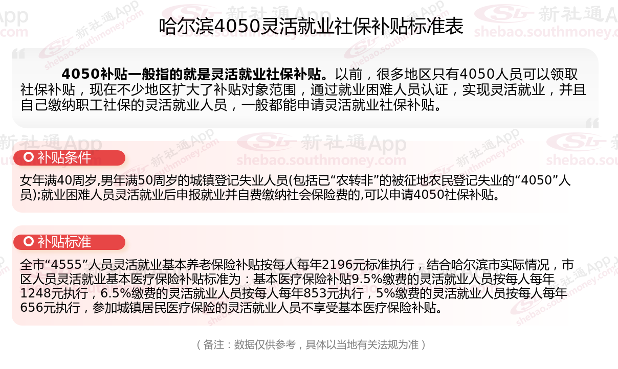 以上就是哈尔滨4050灵活就业社保补贴的相关内容,欢迎关注新社通/下载新社通APP了解更多五险一金专业资讯。