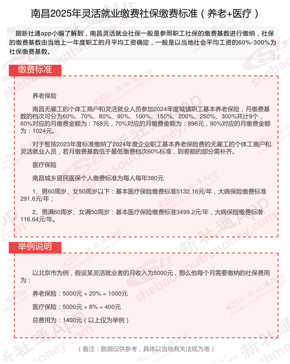 据新社通app数据显示,南昌灵活就业养老保险的缴费基数为:3839元。灵活就业人员参保缴费的比例为个人20%。