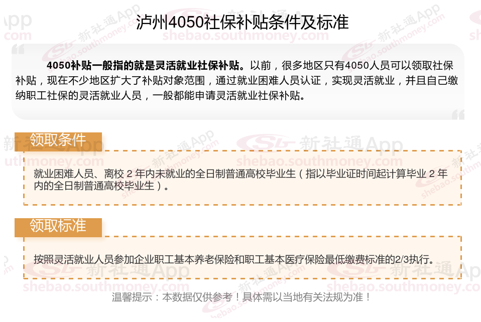 一、2025年泸州4050社保补贴标准及条件是多少?