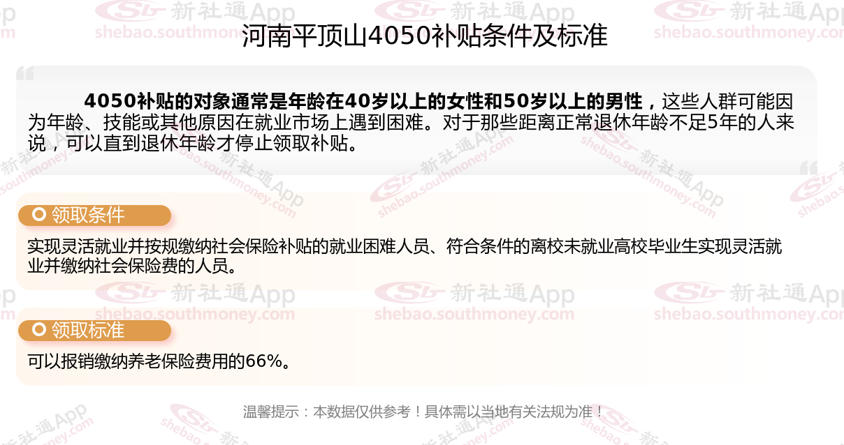 二、2025年河南平顶山4050社保补贴标准是多少?领取条件是什么?