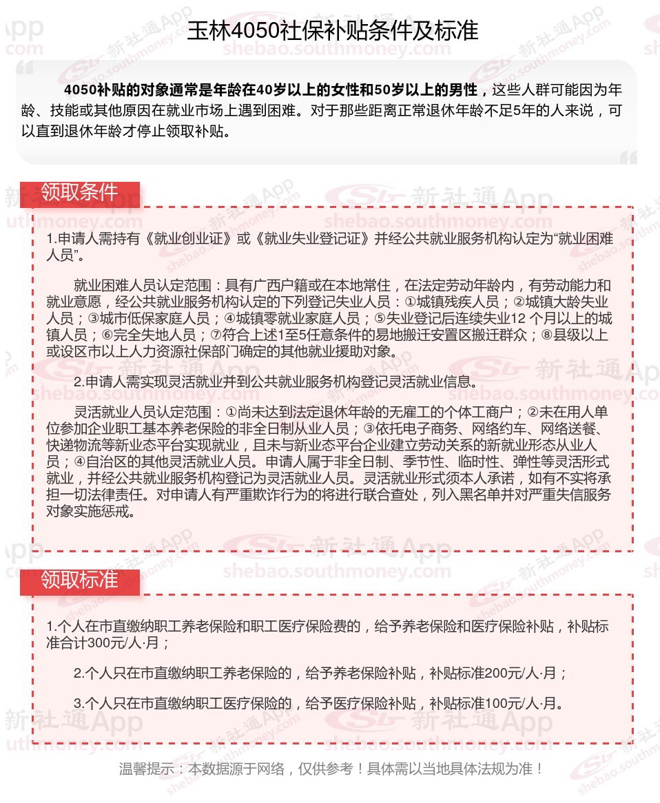 一、2025年玉林4050社保补贴标准及条件是多少?