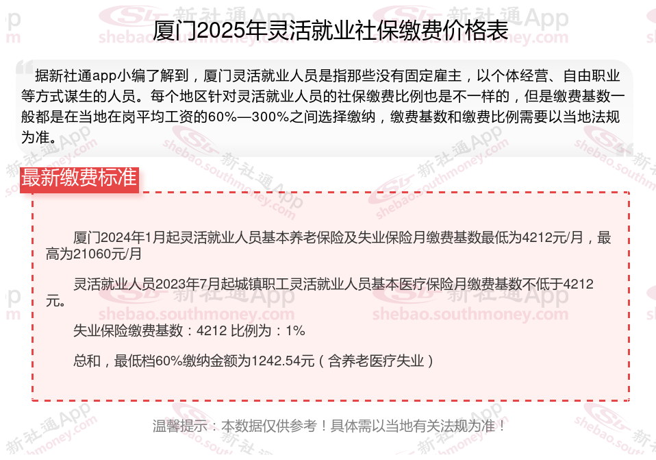 据新社通app数据显示,厦门灵活就业养老保险缴费基数2024-2025年最新标准如下: