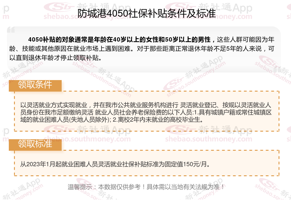防城港4050灵活就业社保补贴是什么?今天聊一下4050补贴话题。4050补贴听起来像是一个针对特定年龄人群的社保补贴。比如女性需年满40周岁,男性需年满50周岁(以申请当年12月31日为截止日期)。那么防城港4050灵活就业社保补贴标准是多少钱?防城港4050社保补贴可以领取多少?接下来随新社通APP小编了解一下防城港4050灵活就业社保补贴的最新资讯。