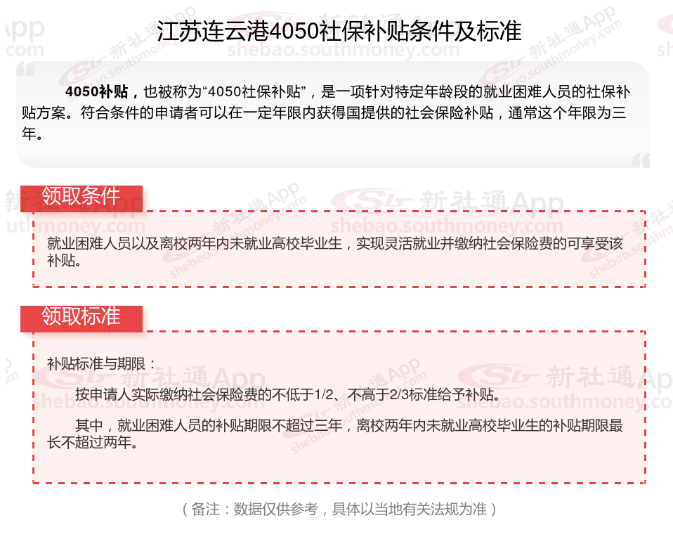 4050补贴主要是针对大龄就业困难人群的社保补贴,申请条件包括年龄、就业困难、灵活就业并自费缴纳社保,需要持有失业登记证,不同地区可能有细微差别,比如农村户口的限制。那么江苏连云港4050灵活就业社保补贴标准是多少钱?江苏连云港4050社保补贴条件是什么?接下来随新社通APP小编了解一下最新资讯。