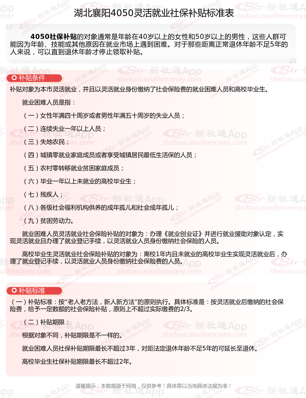 二、湖北襄阳4050社保补贴标准及条件4050社保补贴,最新如下