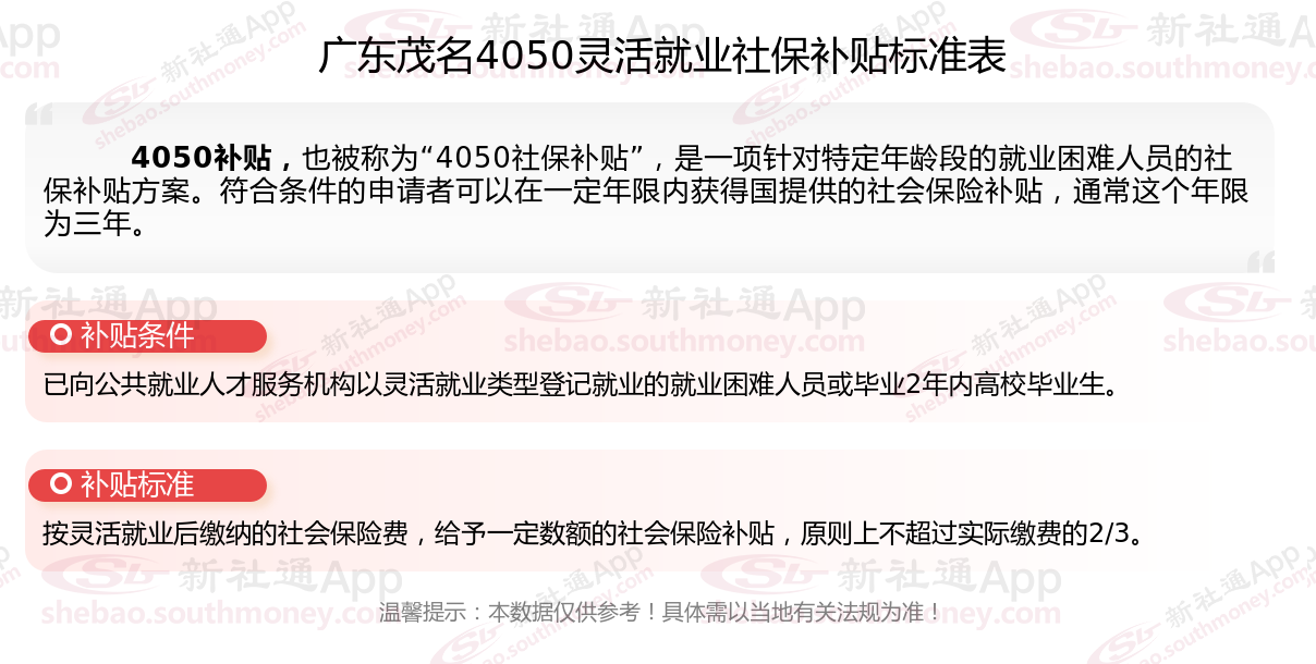 一、广东茂名4050社保补贴标准是什么?附条件