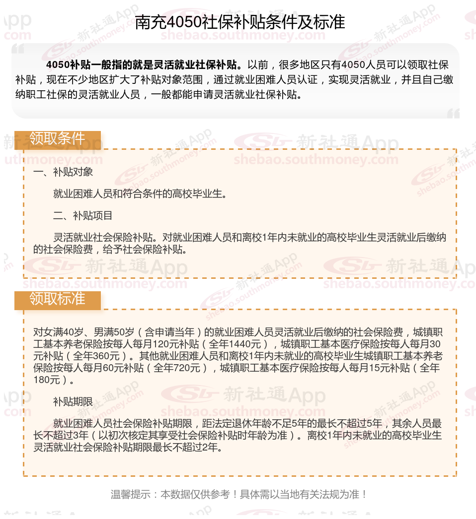 “灵活就业4050社保补贴”需要以灵活就业身份参加职工养老和医疗保险,补贴标准不超过实际缴费的三分之二,最长3年,距离退休不足5年的可延长到退休。补贴对象包括国企下岗人员、低保家庭等。申请流程需要提交身份证、银行账户等。那么南充4050灵活就业困难人员社保补贴标准是多少?南充4050社保补贴需要符合什么条件?接下来随新社通APP小编具体了解一下4050社保补贴内容。