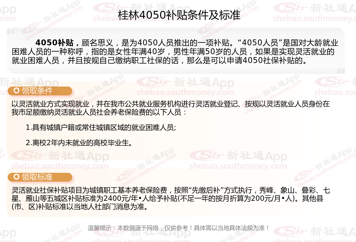 桂林4050灵活就业社保补贴是什么?今天聊一下4050补贴话题。44050社保补贴标准据新社通app小编了解,通常,4050社保补贴包含基本医疗保险和基本养老保险两个险种,社保补贴金额为申请人实际缴纳基本养老保险和基本医疗保险金额的2/3,具体标准以当地社保局公布的数据为准!那么桂林4050灵活就业社保补贴标准是多少钱?桂林4050社保补贴可以领取多少?接下来随新社通APP小编了解一下桂林4050灵活就业社保补贴的最新资讯。