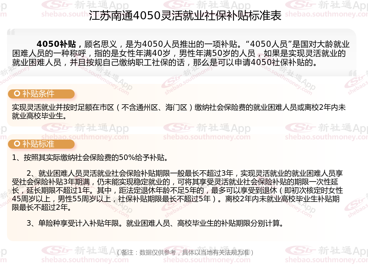 以上就是江苏南通4050灵活就业社保补贴的相关内容,欢迎关注新社通/下载新社通APP了解更多五险一金专业资讯。
