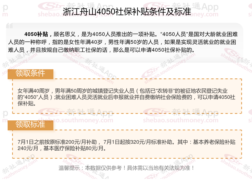 浙江舟山4050灵活就业社保补贴是什么?今天聊一下4050补贴话题。44050社保补贴标准据新社通app小编了解,通常,4050社保补贴包含基本医疗保险和基本养老保险两个险种,社保补贴金额为申请人实际缴纳基本养老保险和基本医疗保险金额的2/3,具体标准以当地社保局公布的数据为准!那么浙江舟山4050灵活就业社保补贴标准是多少钱?浙江舟山4050社保补贴可以领取多少?接下来随新社通APP小编了解一下浙江舟山4050灵活就业社保补贴的最新资讯。