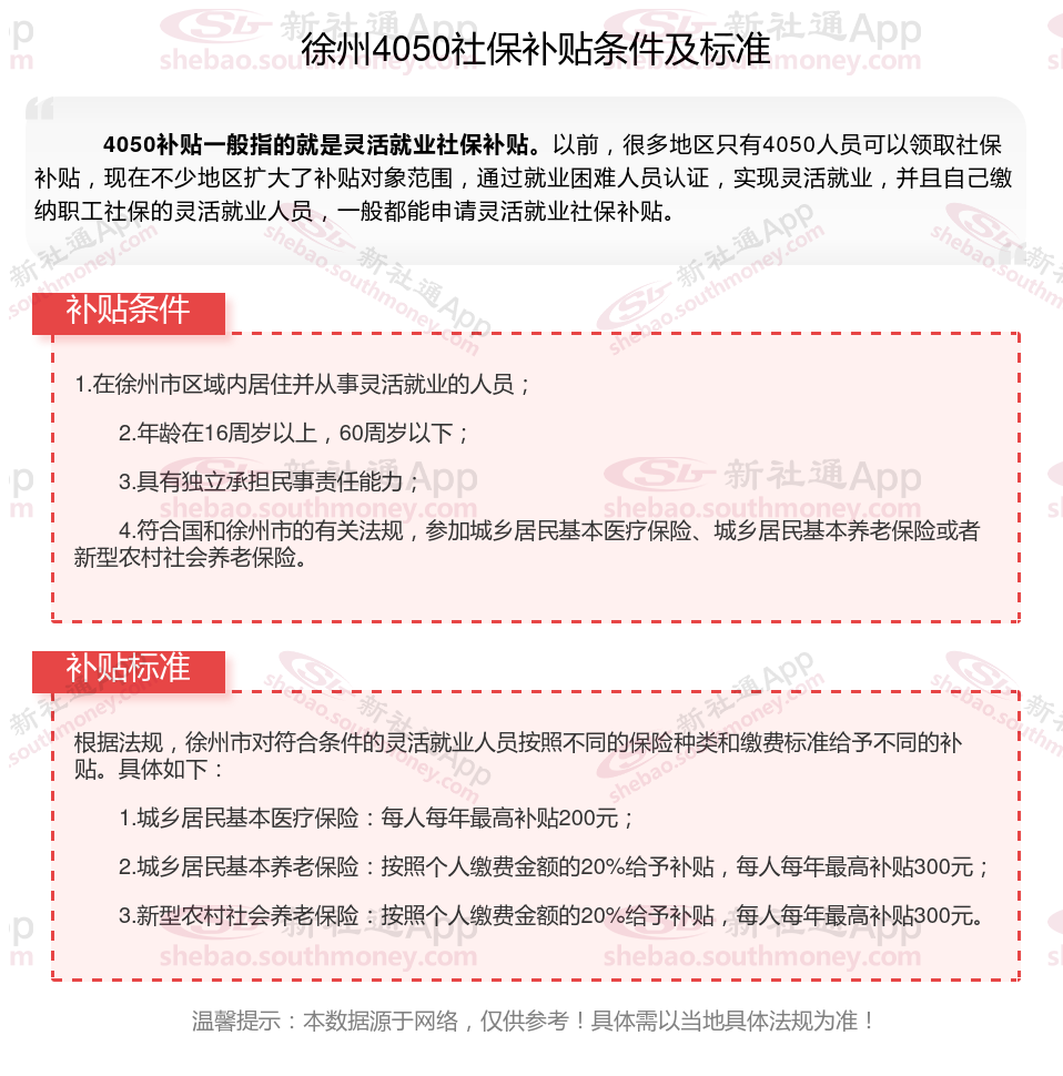 二、2025年徐州4050社保补贴标准及条件,最新如下: