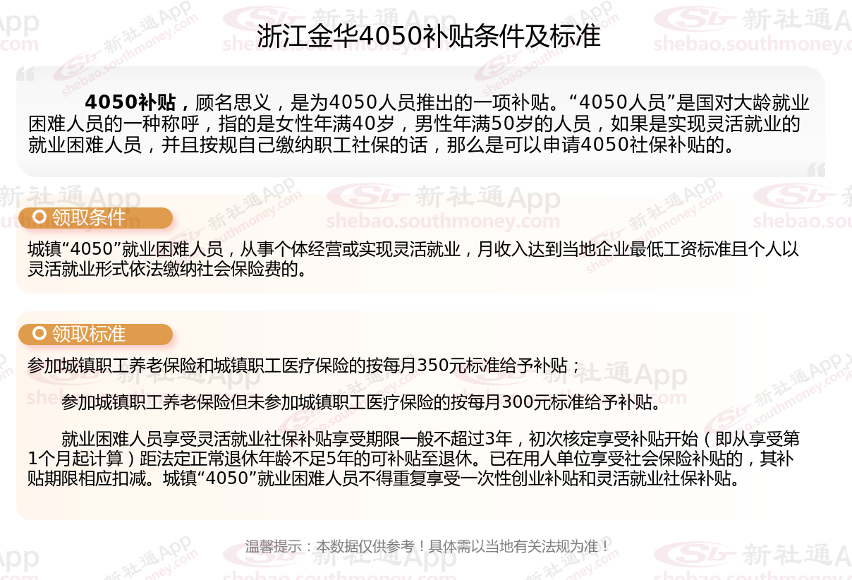2025浙江金华灵活就业4050社保补贴是一项面向特定年龄段的就业困难人群的社会保险补贴。