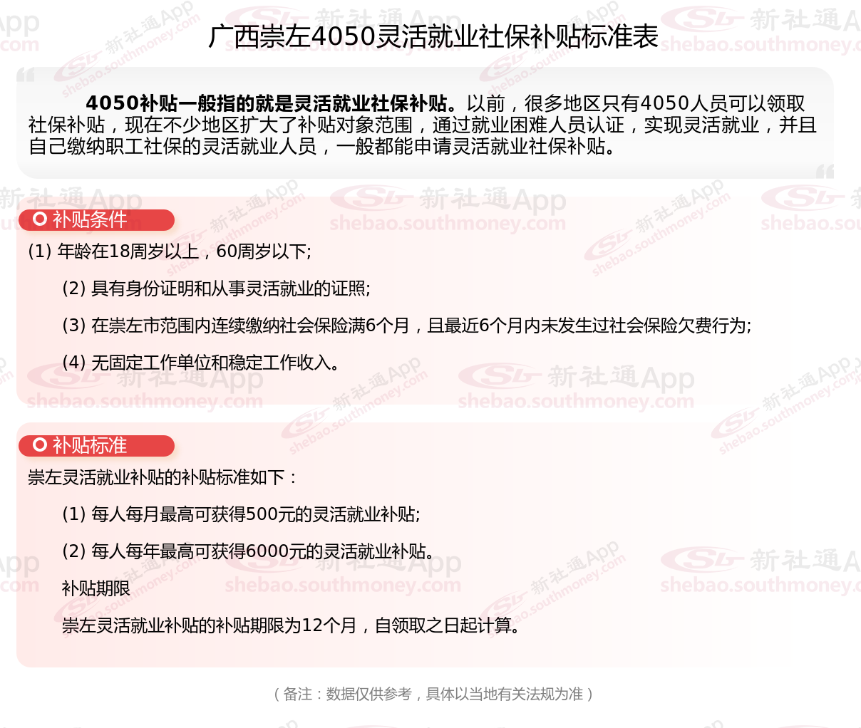 以上就是广西崇左4050灵活就业社保补贴的相关内容,欢迎关注新社通/下载新社通APP了解更多五险一金专业资讯。