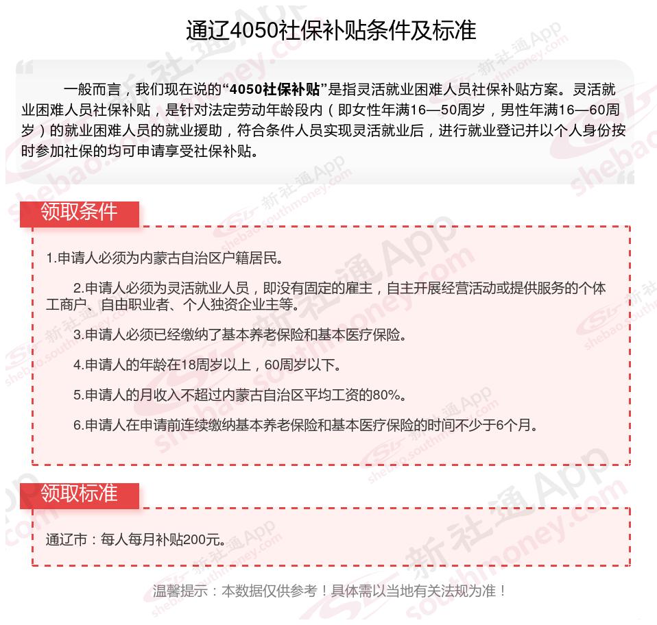 一、通辽4050社保补贴标准及条件2025年最新消息