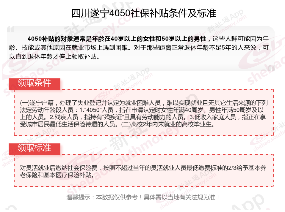 二、2025年四川遂宁4050社保补贴标准(四川遂宁4050灵活就业人员补贴标准是多少钱?四川遂宁2025年4050补贴新规能领多少钱?)