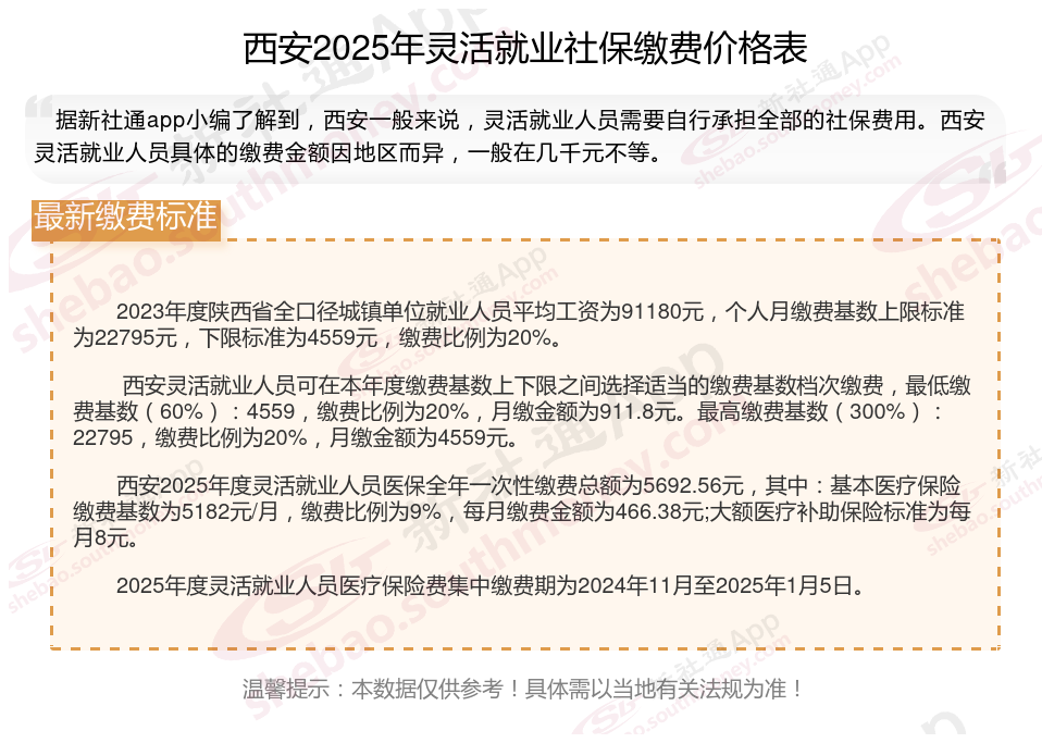 2025年西安灵活就业人员社保需要交多少钱?社保缴费的金额取决于多个因素,包括缴费基数和缴费比例,且各地标准存在差异。下面随新社通小编一起来看看。