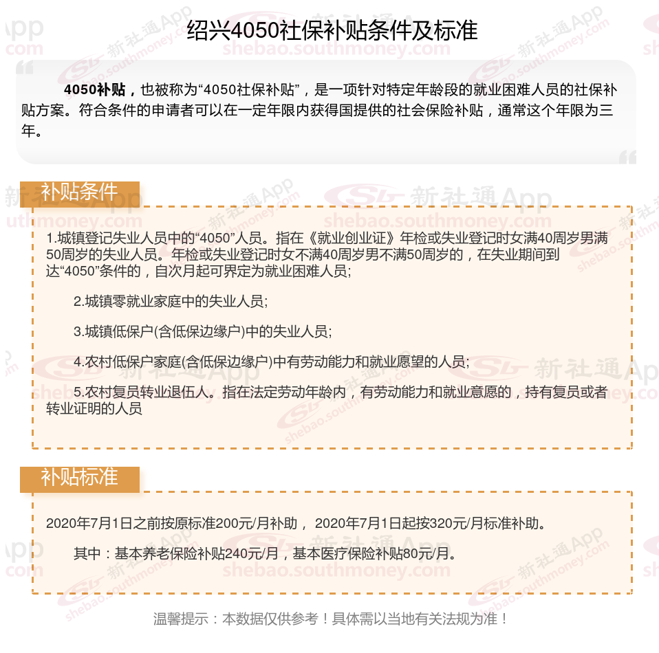 二、绍兴4050社保补贴标准及条件4050社保补贴,最新如下
