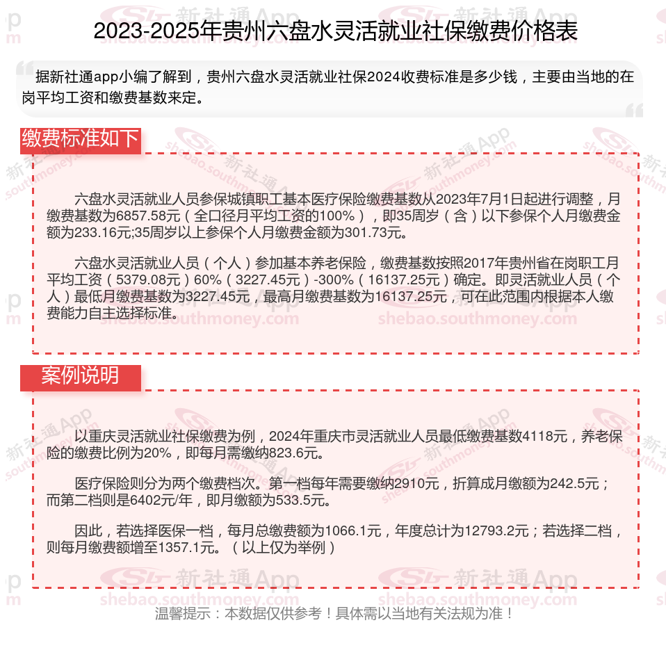 一、2025年贵州六盘水灵活就业社保缴费标准表 贵州六盘水灵活就业社保多少钱一个月?