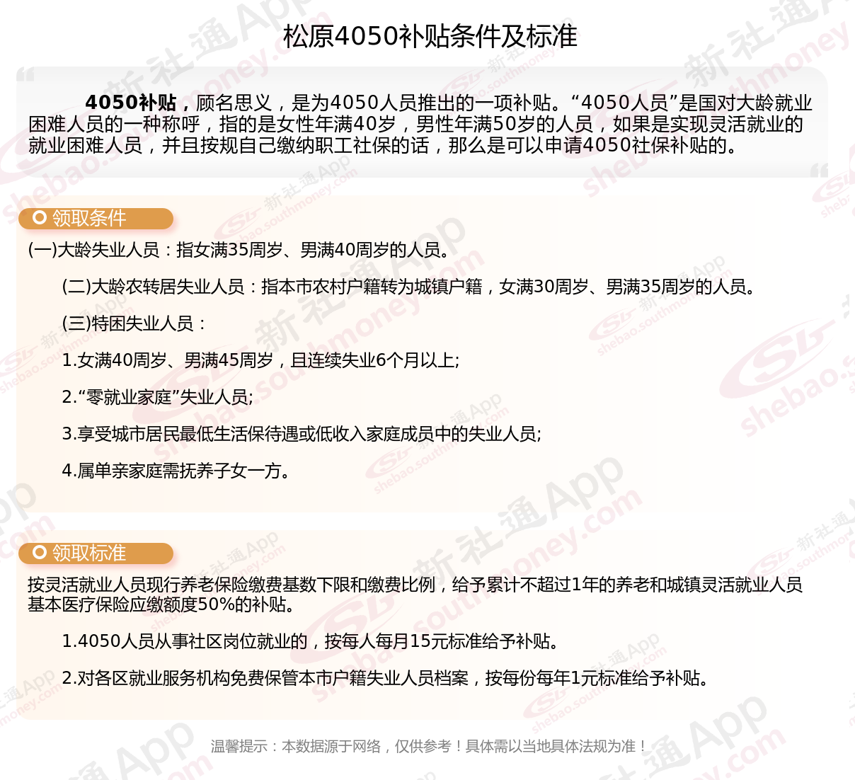 今天聊一下4050补贴话题。4050补贴听起来像是一个针对特定年龄人群的社保补贴。比如女性需年满40周岁,男性需年满50周岁(以申请当年12月31日为截止日期)。那么松原4050灵活就业社保补贴标准是多少钱?松原4050社保补贴条件是什么?接下来随新社通APP小编了解一下最新资讯。