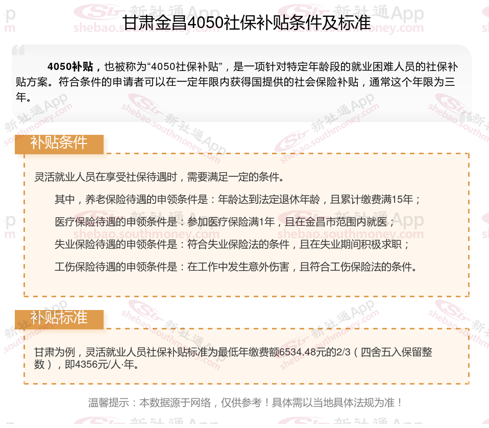 二、2025年甘肃金昌4050社保补贴标准及条件,最新如下: