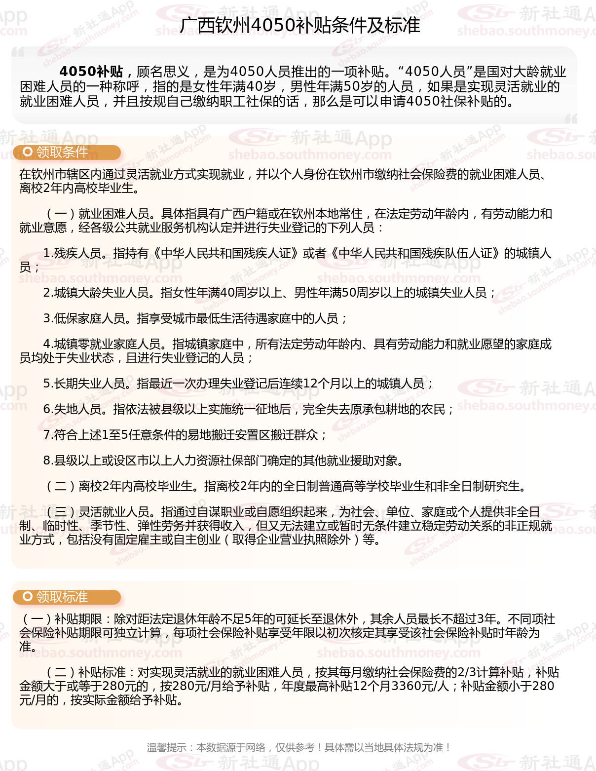今天聊一下4050补贴的相关内容。4050补贴听起来像是一个针对特定年龄人群的社保补贴。比如女性需年满40周岁,男性需年满50周岁(以申请当年12月31日为截止日期)。那么广西钦州4050灵活就业困难人员社保补贴多少钱?广西钦州4050社保补贴可以申请吗?接下来随新社通APP小编具体了解一下4050社保补贴内容。