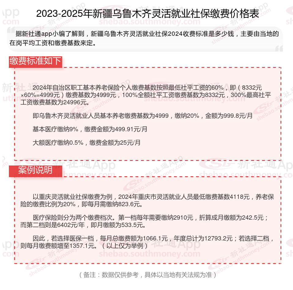 据新社通app数据显示,新疆乌鲁木齐灵活就业养老保险缴费基数2024-2025年最新标准如下: