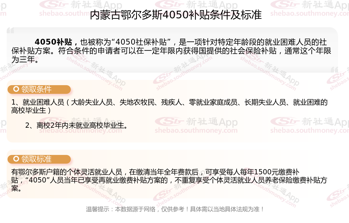 一、2023-2024年内蒙古鄂尔多斯4050社保补贴标准及条件是多少?