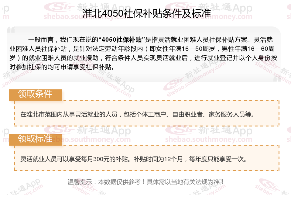 三、淮北灵活就业4050社保补贴标准及条件是什么