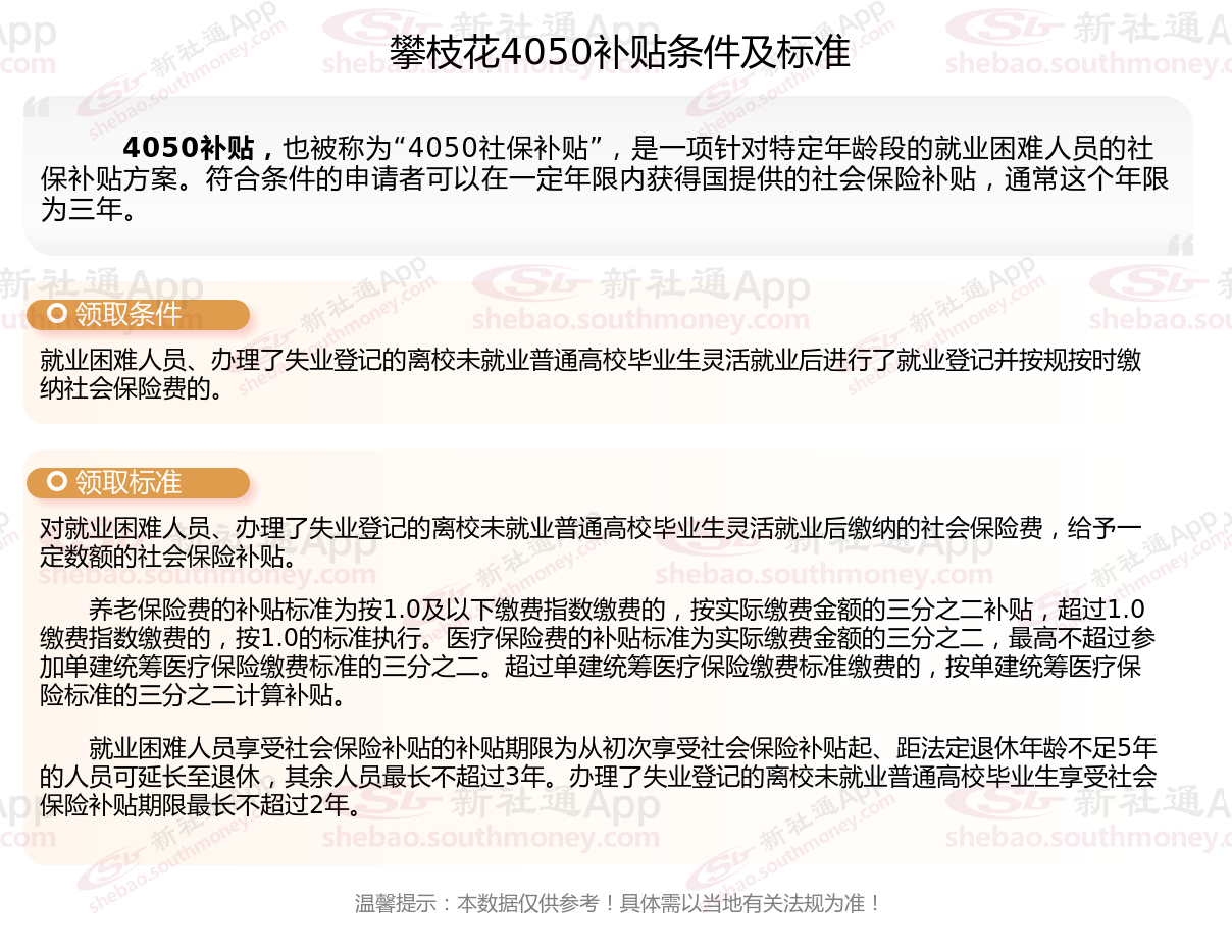 二、2025年攀枝花4050社保补贴标准及条件,最新如下: