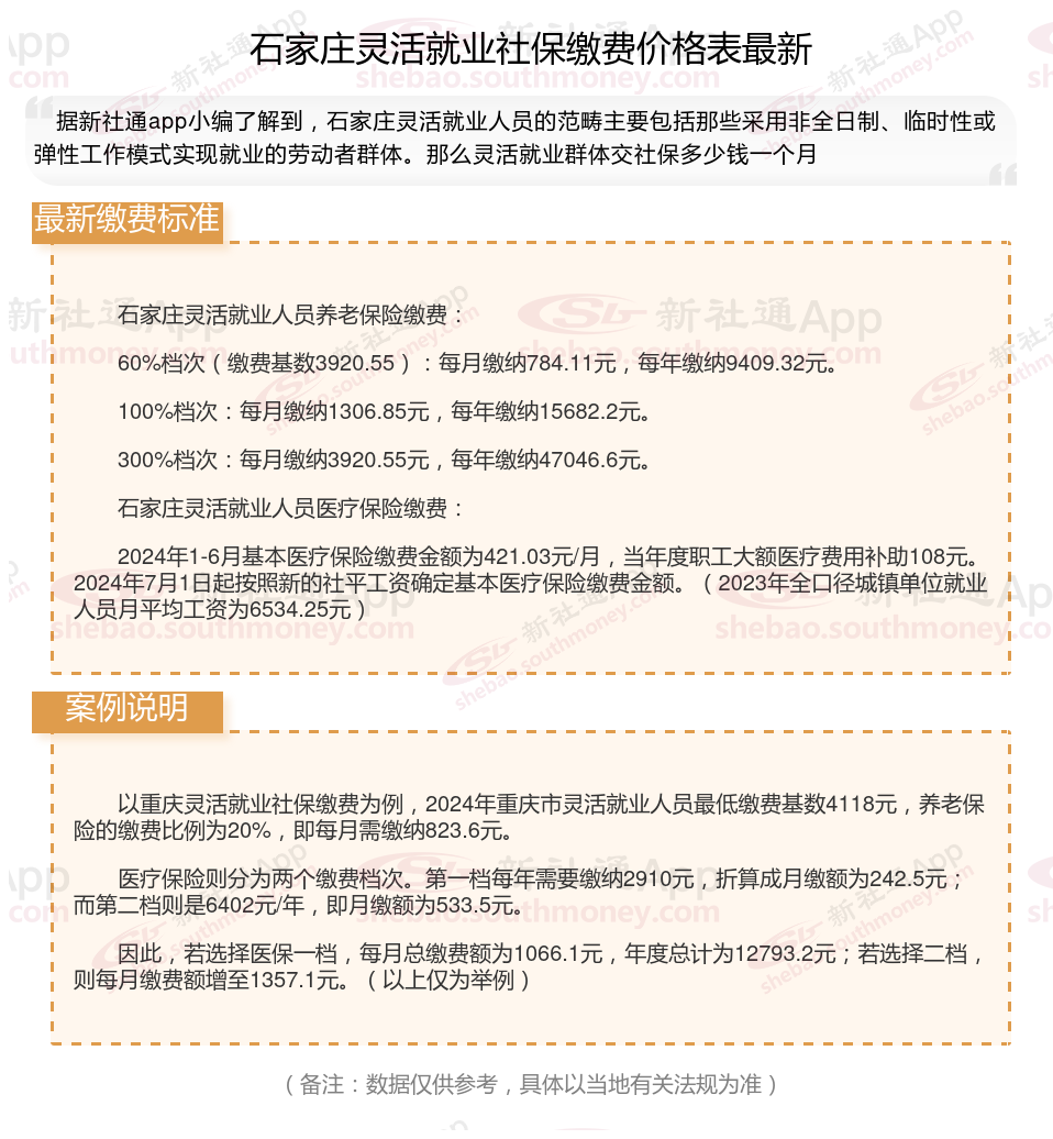石家庄灵活就业社保2025年收费标准是多少钱,主要由当地的在岗平均工资和缴费基数来定。其次,灵活就业社保缴纳跟职工缴纳不同的地方在于,灵活就业社保参保只能参保养老保险和医疗保险,且缴纳比例完全由个人承担。另外,灵活就业人员社保参保选择,可自由选择参保城镇职工社保和城乡居民保险。2025年石家庄灵活就业社保缴多少钱?如何缴纳?怎么计算待遇?新社通APP小编将在下文为您详细说明。