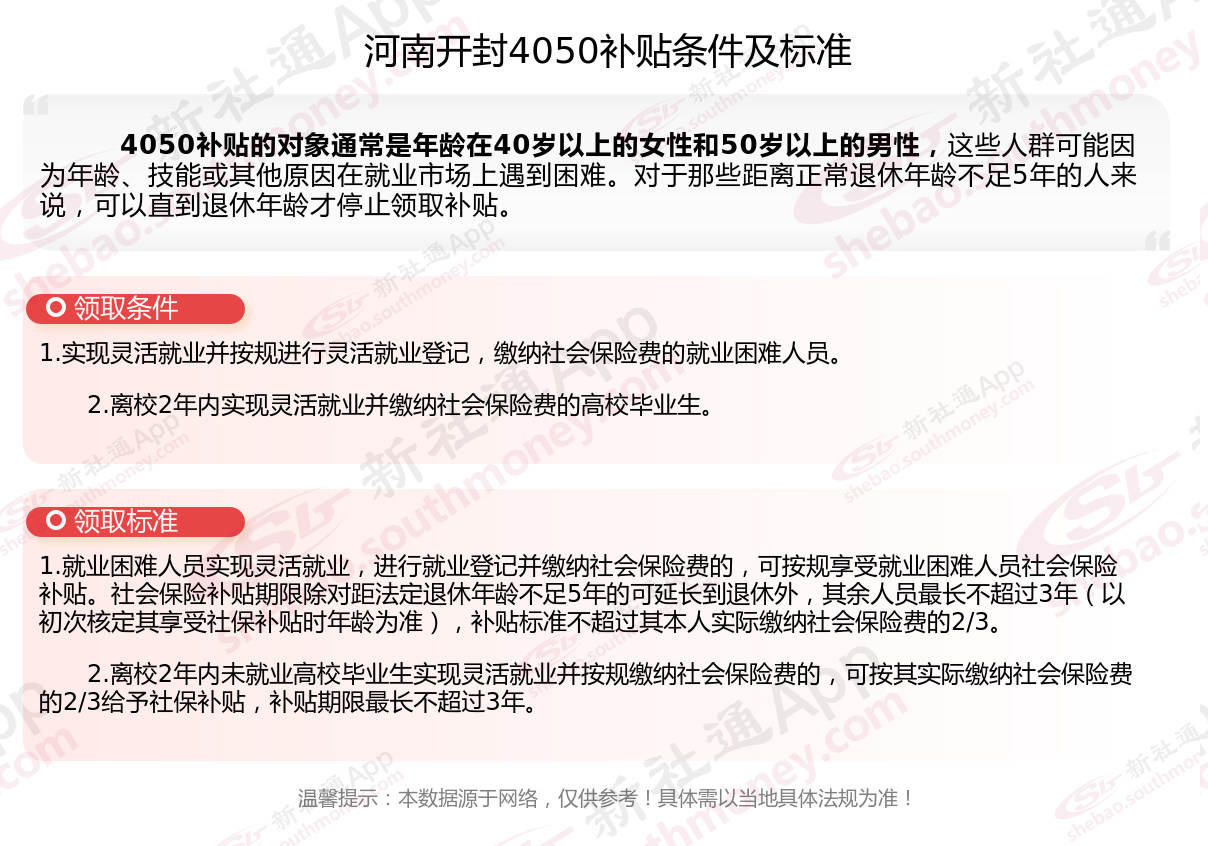 三、河南开封灵活就业4050社保补贴标准及条件是什么