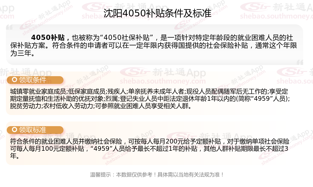 二、2025年沈阳4050社保补贴标准及条件,最新如下: