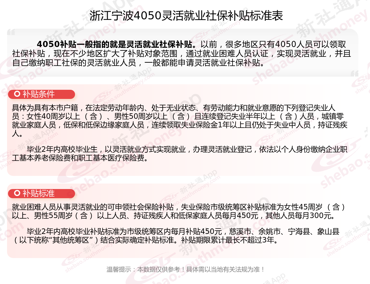一、浙江宁波4050社保补贴标准及条件2025年最新消息