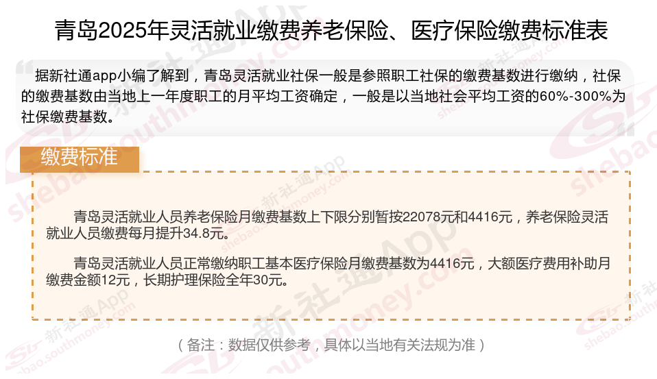 据新社通app数据显示,青岛灵活就业养老保险缴费基数2024-2025年最新标准如下: