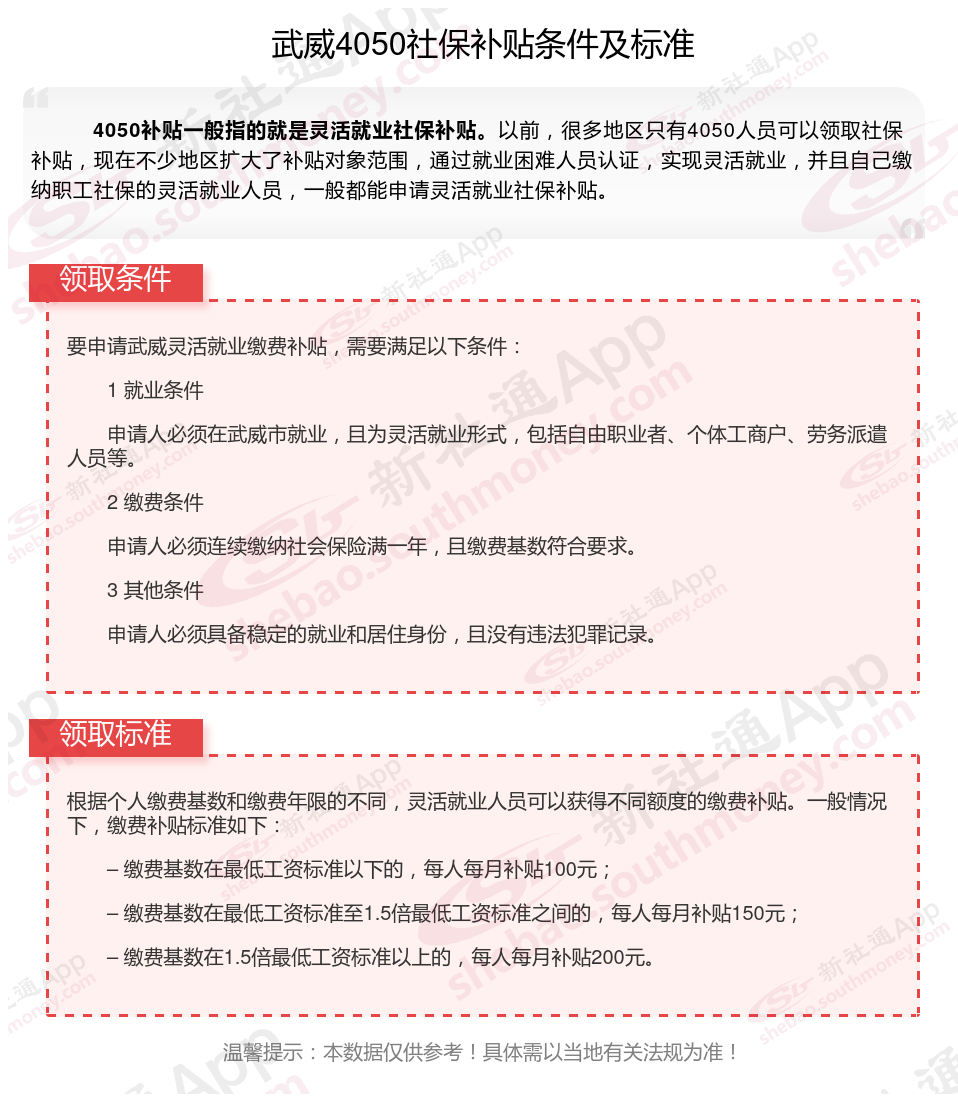 “灵活就业4050社保补贴”需要以灵活就业身份参加职工养老和医疗保险,补贴标准不超过实际缴费的三分之二,最长3年,距离退休不足5年的可延长到退休。补贴对象包括国企下岗人员、低保家庭等。申请流程需要提交身份证、银行账户等。那么武威4050灵活就业困难人员社保补贴标准是多少?武威4050社保补贴需要符合什么条件?接下来随新社通APP小编具体了解一下4050社保补贴内容。