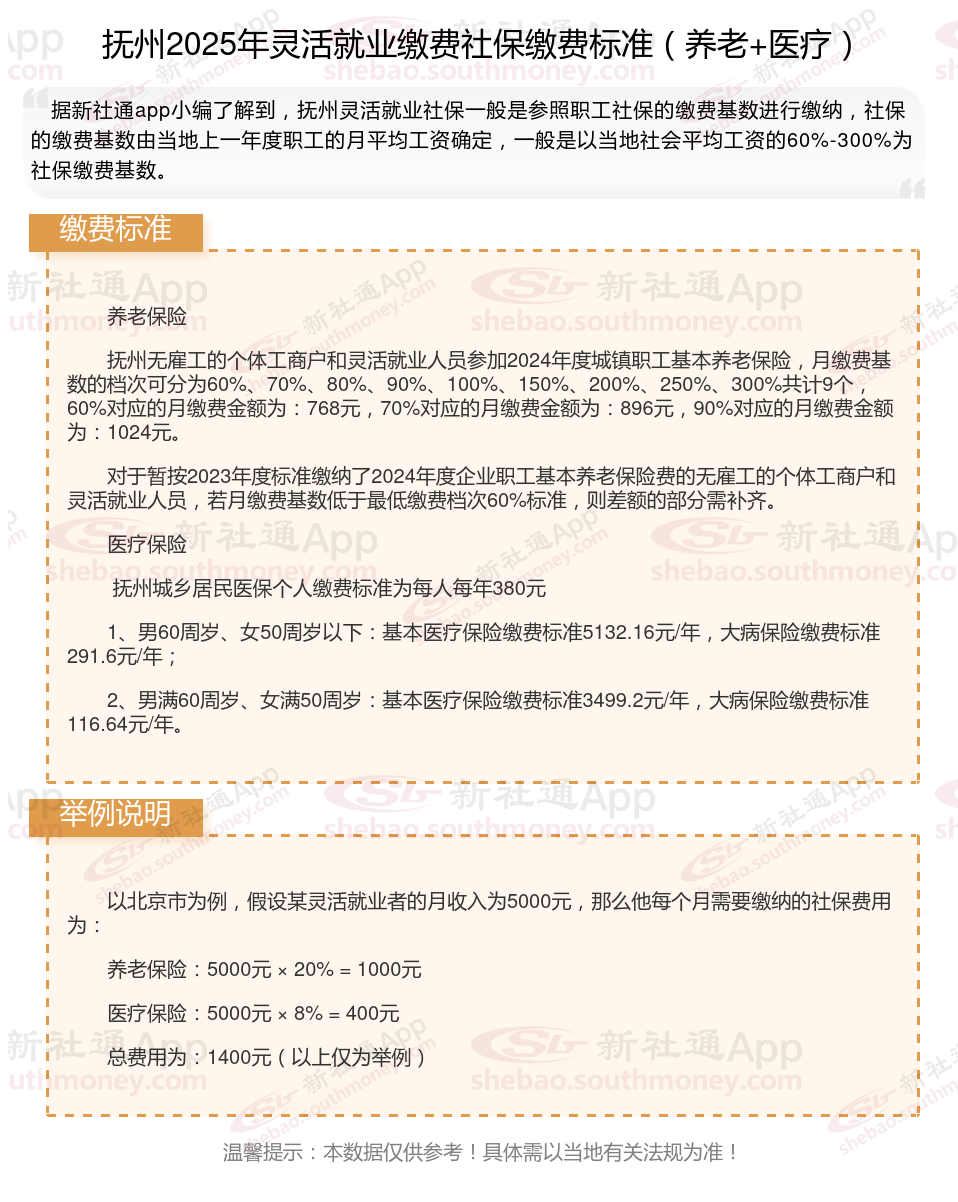 随着经济社会的不断发展,灵活就业群体不断地日益壮大,其社保缴费问题也愈发受到关注。那么2025年抚州灵活就业人员社保交多少钱,你了解2025年抚州灵活就业人员社保缴费基数及比例吗,接下来随新社通APP小编一起来看看。