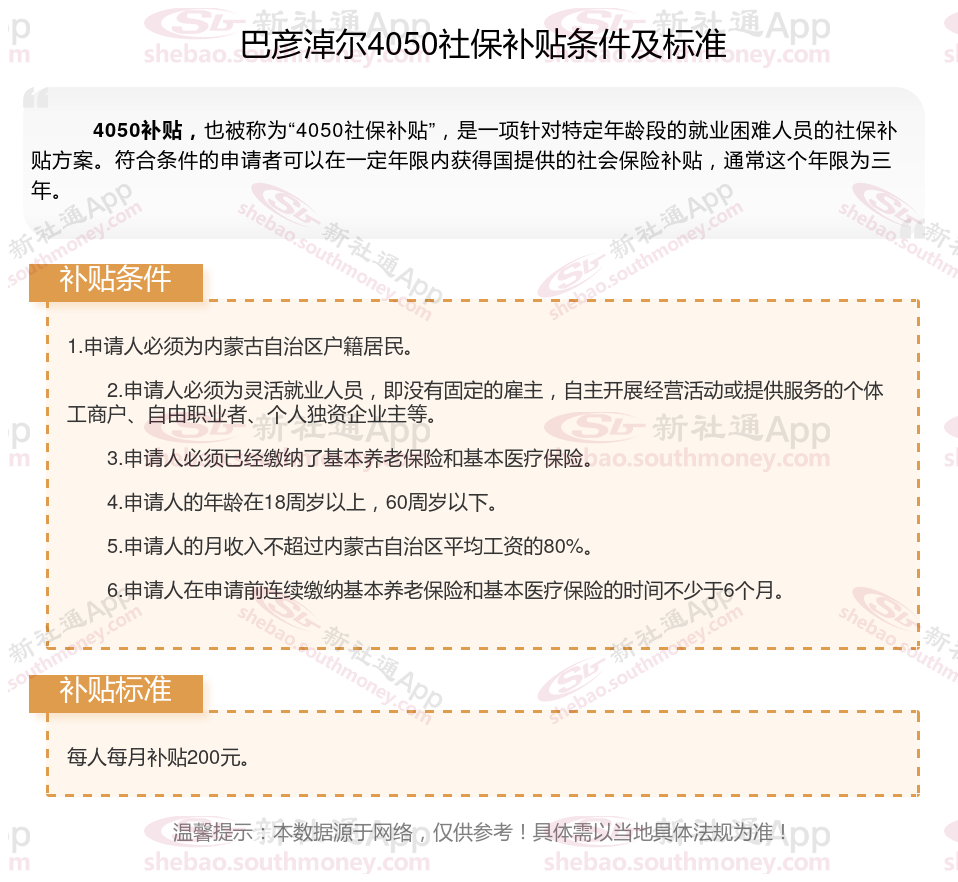 二、2025年巴彦淖尔4050社保补贴标准及条件