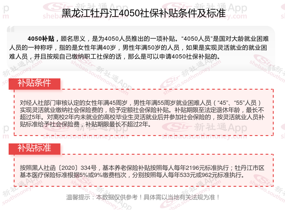 4050社保补贴标准据新社通app小编了解,通常,4050社保补贴包含基本医疗保险和基本养老保险两个险种,社保补贴金额为申请人实际缴纳基本养老保险和基本医疗保险金额的2/3,具体标准以当地社保局公布的数据为准!那么黑龙江牡丹江灵活就业人员4050补贴最新标准是多少,黑龙江牡丹江4050灵活就业人员社保补贴一年可以有多少钱?接下来随新社通APP小编具体了解一下4050社保补贴内容。