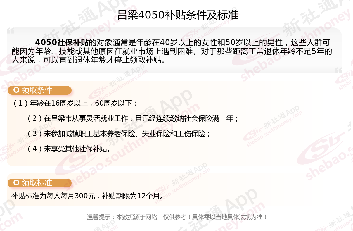 二、2025年吕梁灵活就业4050社保补贴标准及条件是什么?来了解一下