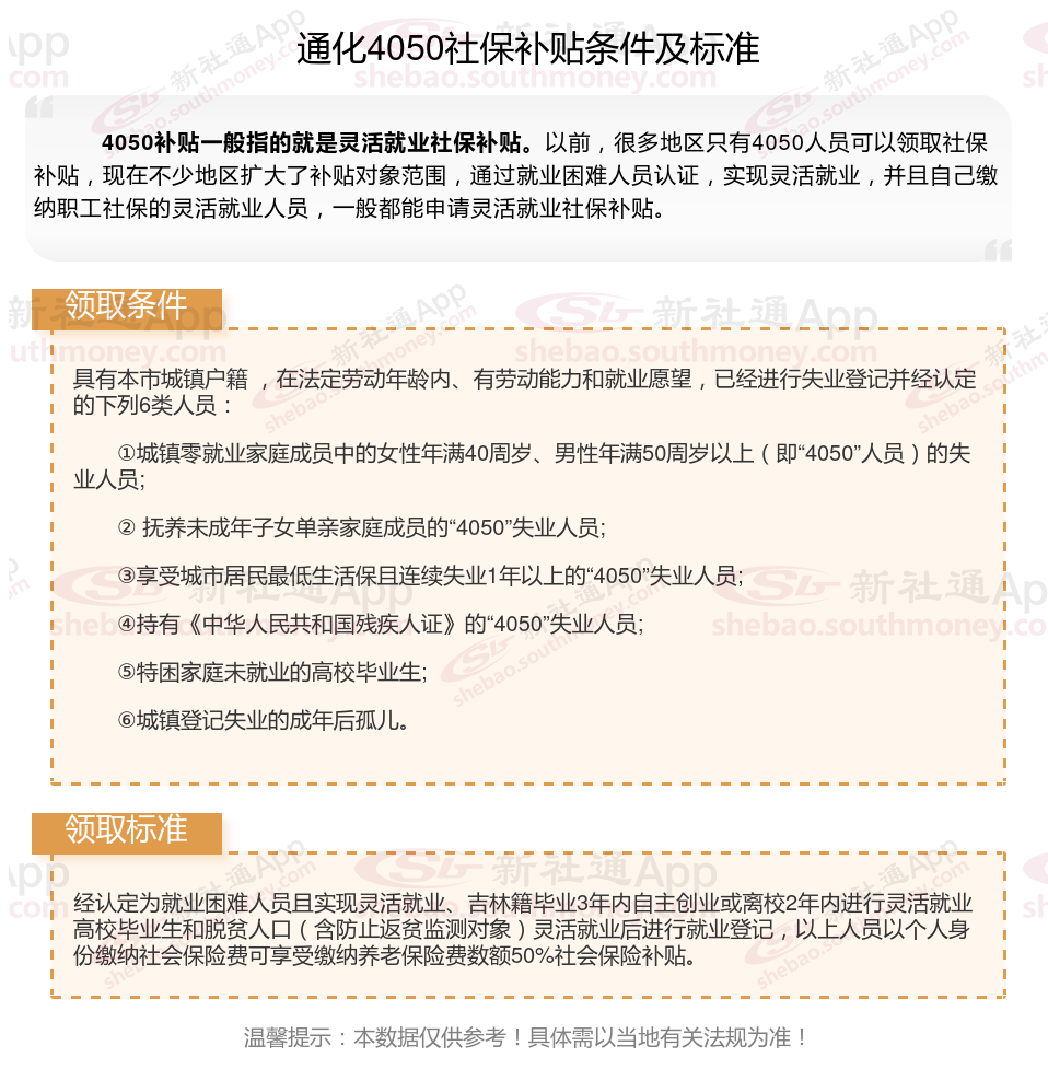 通化4050社保补贴多少钱一个月?通化4050社保补贴2025年最新标准是多少?2025通化4050补贴主要针对的是年龄在40岁以上的女性和50岁以上的男性,这些人群通常因为年龄较大而面临就业困难。