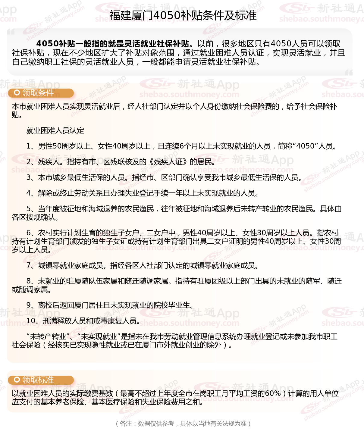 2025福建厦门灵活就业4050社保补贴是一项面向特定年龄段的就业困难人群的社会保险补贴。