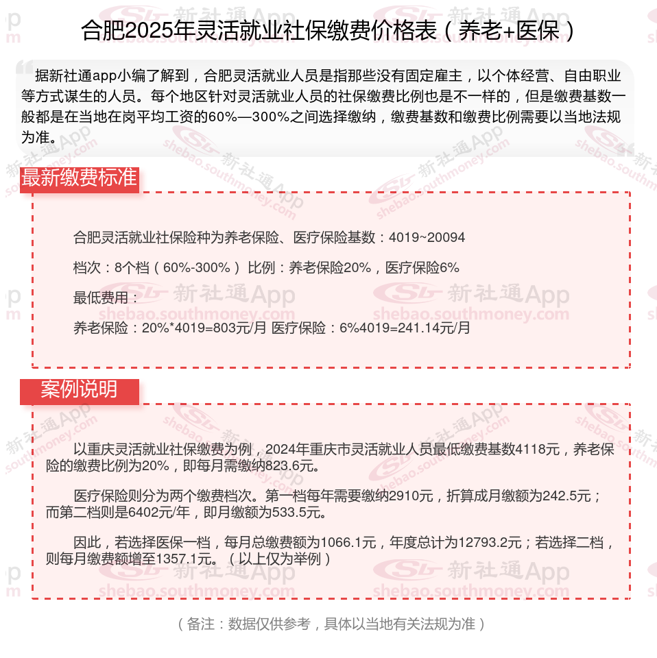 据新社通app数据显示,合肥灵活就业养老保险缴费基数2024-2025年最新标准如下: