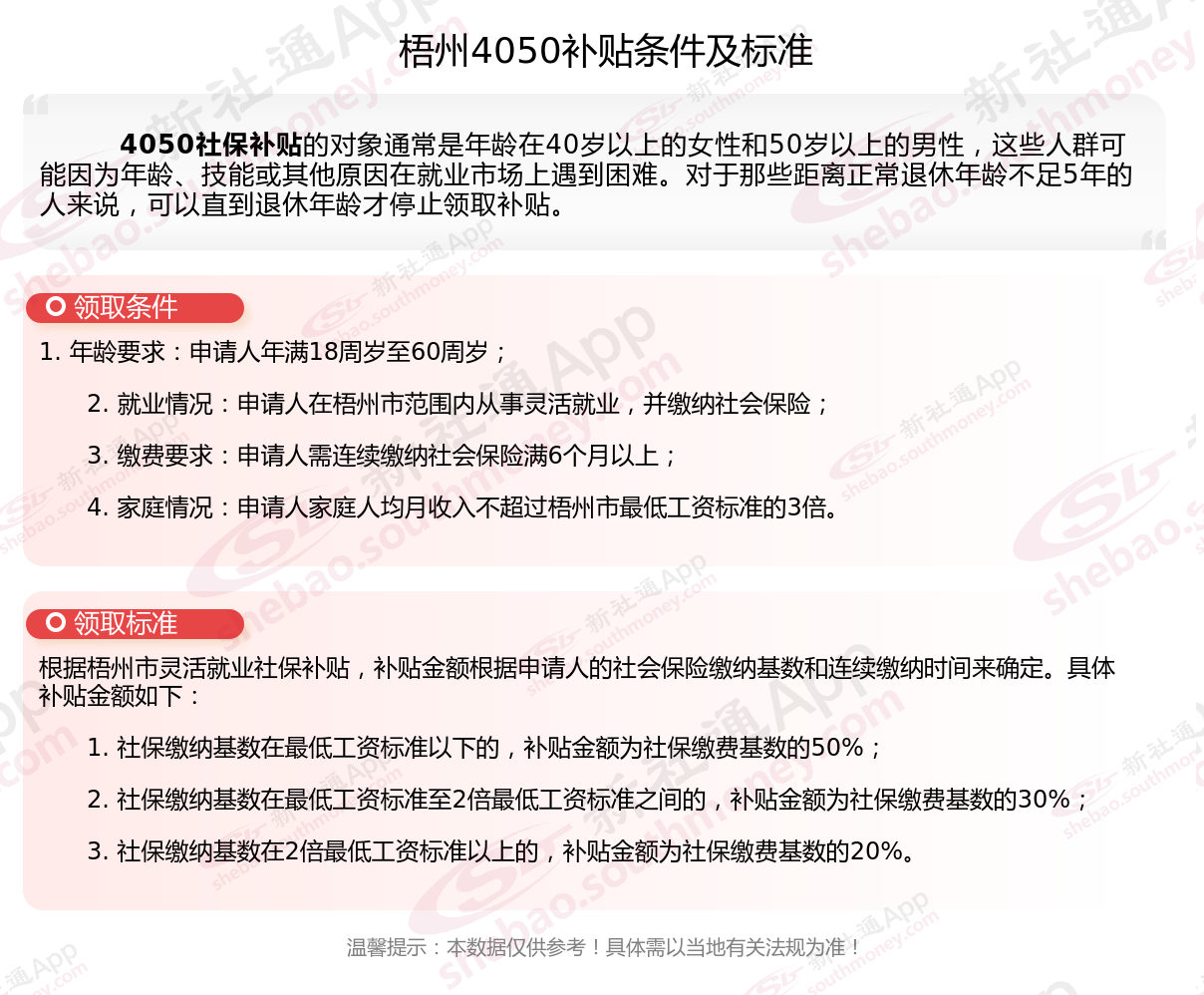 二、2025年梧州4050社保补贴标准及条件是什么?