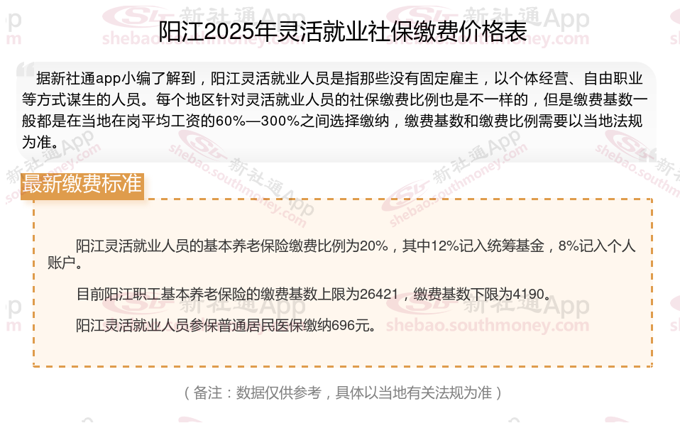 阳江社保缴费多少钱?下表是2024-2025年阳江社保费用明细参考,根据新社通app-社保缴费查询工具提供的最新数据如下: