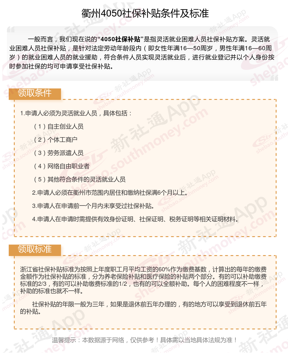 一、2025年衢州4050社保补贴标准是怎么样的,附领取条件