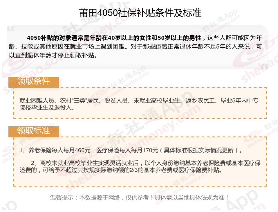 二、2025年莆田4050社保补贴标准及条件,最新如下: